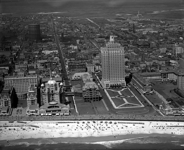 Aerial views of the Boardwalk in Atlantic City, New Jersey. Views are taken from a lower vantage point so that several hotels and surrounding areas can be seen in some detail.