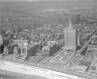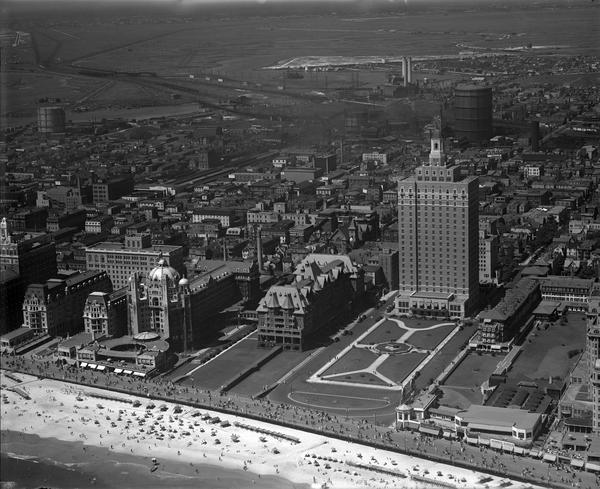Aerial views of the Boardwalk in Atlantic City, New Jersey. Views are taken from a lower vantage point so that several hotels and surrounding areas can be seen in some detail.