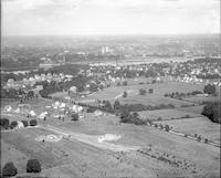 Aerial views of a large house being constructed in an area of sparse residential development in Morrisville, Pennsylvania. The Delaware River, a more densely populated area of Morrisville, and Trenton, New Jersey are all visible in the distance.
