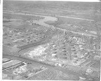 Aerial views of the Atlantic Refining Company (later Atlantic Richfield Co. or ARCO) petroleum refinery plant along the Schuylkill River in the Point Breeze neighborhood of Philadelphia. The company was founded as the Atlantic Petroleum Storage Company in 1866 as a storage facility but quickly expanded operations to include refining as the possible uses of petroleum were discovered. It was purchased by John D. Rockefeller in 1874 and became part of the Standard Oil Trust and became Atlantic Refining Company after the Trust was dissolved in 1911. The facility is shown from several angles and altitudes and includes views of the refining equipment and storage drums as well as boats and ships docked on the river.