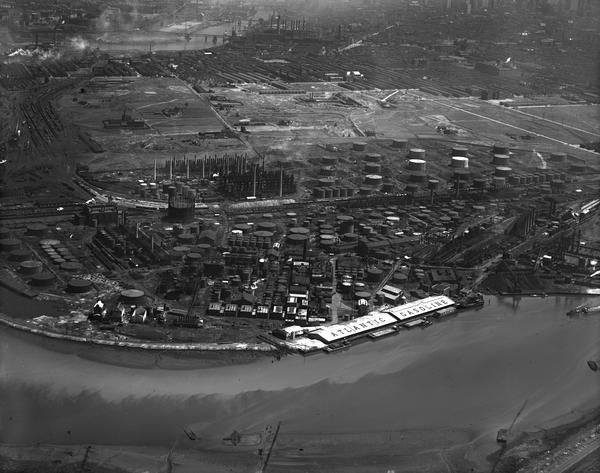 Aerial views of the Atlantic Refining Company (later Atlantic Richfield Co. or ARCO) petroleum refinery plant along the Schuylkill