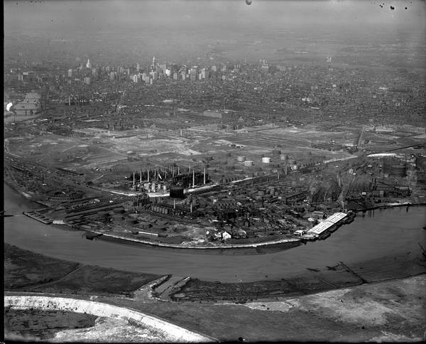 Aerial views of the Atlantic Refining Company (later Atlantic Richfield Co. or ARCO) petroleum refinery plant along the Schuylkill