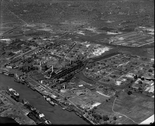 Aerial views of the Atlantic Refining Company (later Atlantic Richfield Co. or ARCO) petroleum refinery plant along the Schuylkill