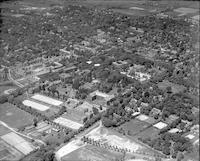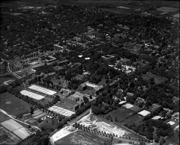 Aerial views of the campus of Princeton University, Princeton, New Jersey. Chartered 1746 as the College of New Jersey. Name changed to Princeton University in 1896. Depicts many campus buildings and two views (6020 and 6021) show nearby stadium.