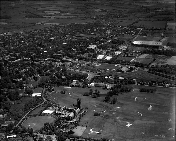 Aerial views of the campus of Princeton University, Princeton, New Jersey. Chartered 1746 as the College of New Jersey. Name changed to Princeton University in 1896. Depicts many campus buildings and two views (6020 and 6021) show nearby stadium.