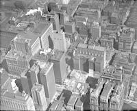 Aerial view showing the 1927 demolition of the Forrest Theatre, located at the southeast corner of Broad and Sansom Streets in Philadelphia. The musical theater was built in 1907 after the designs of architects Amos W. Barnes and Marshall & Fox.