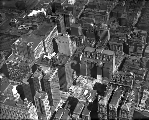 Aerial view showing the 1927 demolition of the Forrest Theatre, located at the southeast corner of Broad and Sansom Streets in Philadelphia. The musical theater was built in 1907 after the designs of architects Amos W. Barnes and Marshall & Fox.