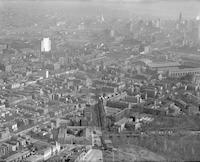 Aerial views of the University of Pennsylvania campus and area around Spruce Street from 33rd to 38th Streets. Includes views of the Quadrangle dormitories, Franklin Field, the University Museum of Archaeology and Anthropology, and the Irvine Auditorium (under construction).