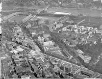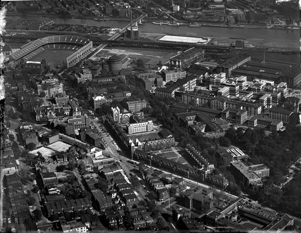 Aerial views of the University of Pennsylvania campus and area around Spruce Street from 33rd to 38th Streets. Includes views