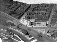 Aerial views of the Fidelity Mutual Life Insurance Company's building at 2501-2515 Fairmount Avenue under construction. Scaffolding flanks the entrance of the nearly completed building while vehicles move along the streets. Designed by Zantzinger, Borie & Medary, the Art Deco building was constructed 1926-1927. Views show a railroad tunnel and large semicircular factory building on the 2600 block of Pennsylvania Avenue. Nearby row homes are visible.