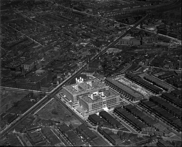 Aerial views of Simon Gratz High School and Elizabeth D. Gillespie Junior High School, located at 18th Street and Hunting