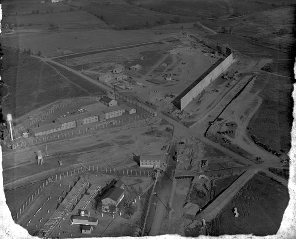 Aerial view showing the construction of the Graterford State Correctional Institution in Graterford, Montgomery County, Pennsylvania. Built 1928-1934 near the Perkiomen Creek. Construction equipment and vehicles are visible. Workers can be seen along the perimeter of the high exterior walls.
