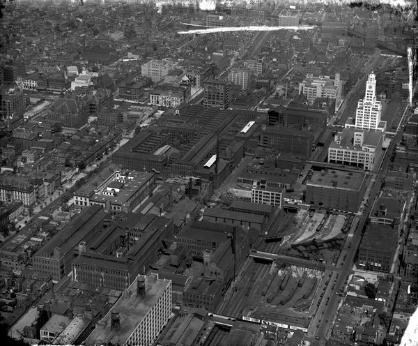 Aerial views of Baldwin Locomotive Works, located at Broad and Spring Garden Streets in Philadelphia. Depicts factory and office buildings, as well as nearby industrial buildings. Includes views of the Elverson Building. Baldwin Locomotive Works buildings at this location were demolished in 1937 after the company moved south of Philadelphia to Eddystone, Pa. in 1928.
