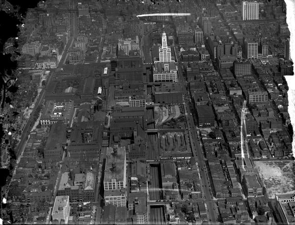 Aerial views of Baldwin Locomotive Works, located at Broad and Spring Garden Streets in Philadelphia. Depicts factory and office buildings, as well as nearby industrial buildings. Includes views of the Elverson Building. Baldwin Locomotive Works buildings at this location were demolished in 1937 after the company moved south of Philadelphia to Eddystone, Pa. in 1928.