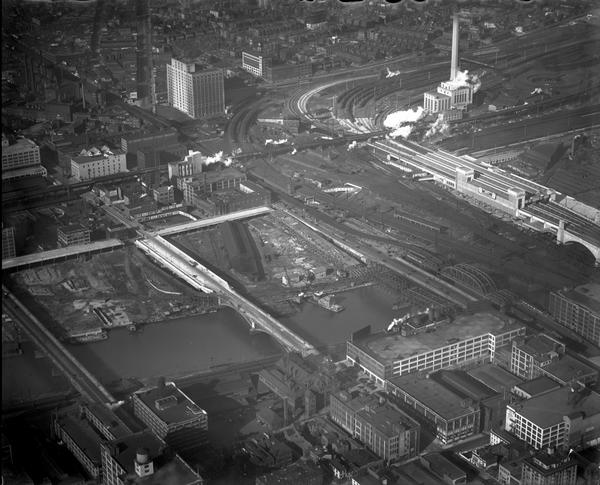 Aerial views of the Schylkill River at 30th and Market Streets prior to the construction of 30th Street Station. View shows the area bounded by John F. Kennedy Boulevard to the north, Walnut Street to the south, 32nd Street to the west and 23rd Street to the east including the Schuylkill River and the Walnut, Chestnut and Market Street bridges. The Pennsylvania Railroad yards are also visible.