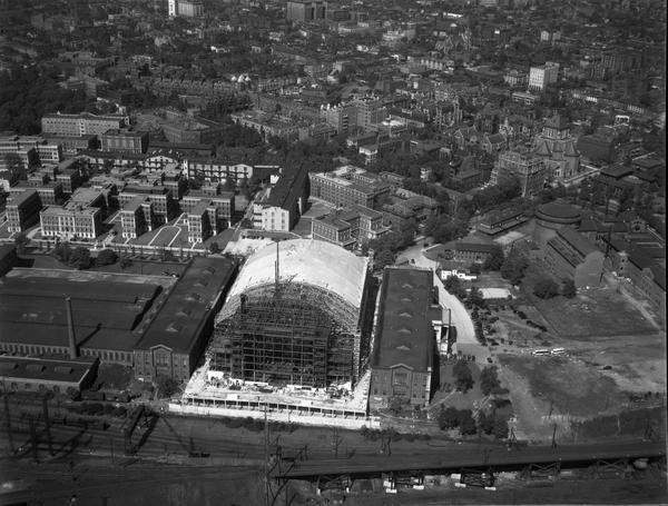 Aerial views of the Municipal Auditorium under construction. The facility was also known as Convention Hall and later as Civic Center Auditorium. The building was designed in the Art Deco style by the architect Philip H. Johnson and was demolished in 2005. View is facing northwest and shows the structure about 50 percent complete, with portions of the University of Pennsylvania campus visible in the distance.