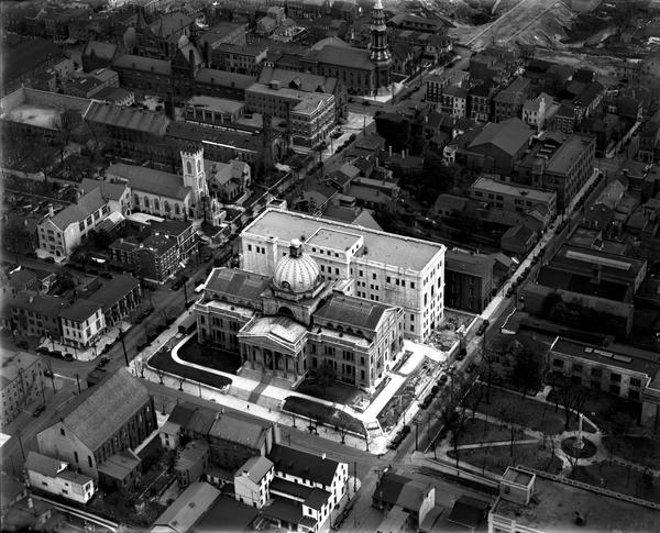 Aerial views of the Montgomery County Courthouse and annex in Norristown, Pennsylvania. The courthouse was built from 1853-1856