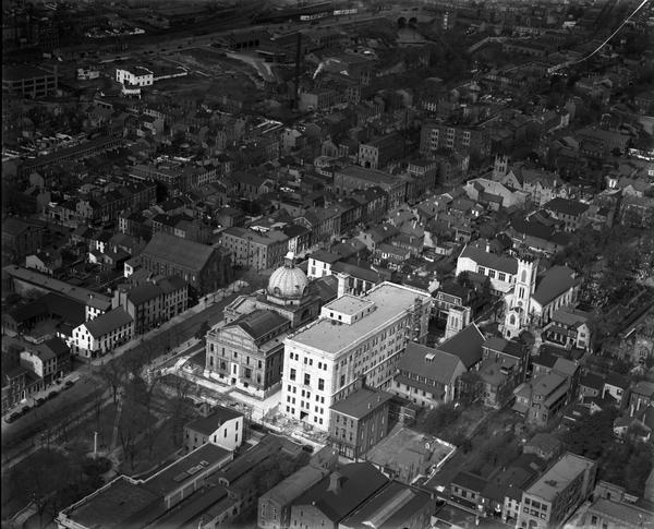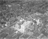 Aerial views of the Montgomery County Courthouse and annex in Norristown, Pennsylvania. The courthouse was built from 1853-1856