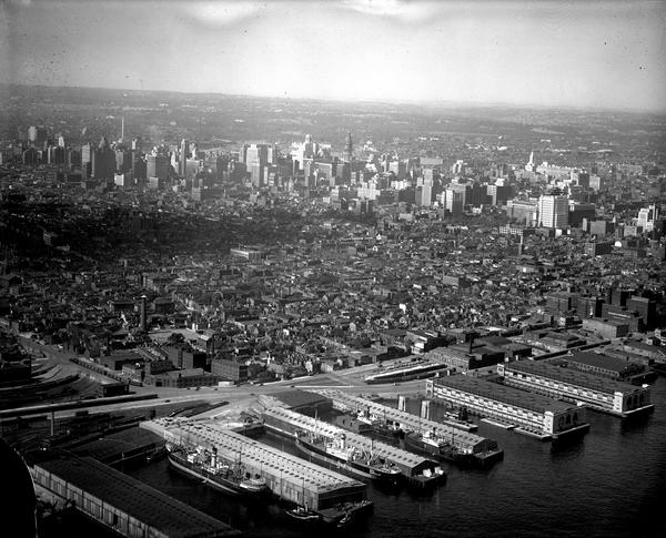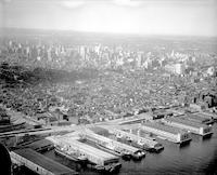 Aerial views of the piers at Washington and Delaware Avenues in South Philadelphia. Ships are docked at the piers. Cars and a trolley can be seen traveling on the city streets. The area to the north and west of the river and the city skyline are visible in the distance.