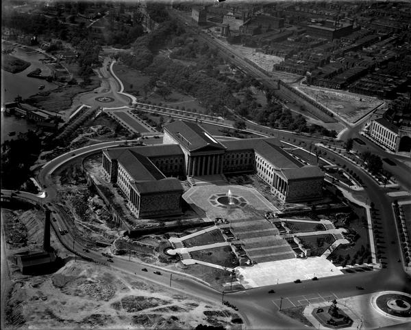 Aerial views showing the Philadelphia Museum of Art, built 1919-1928 after designs by Horace Trumbauer and the firm of Zantzinger,