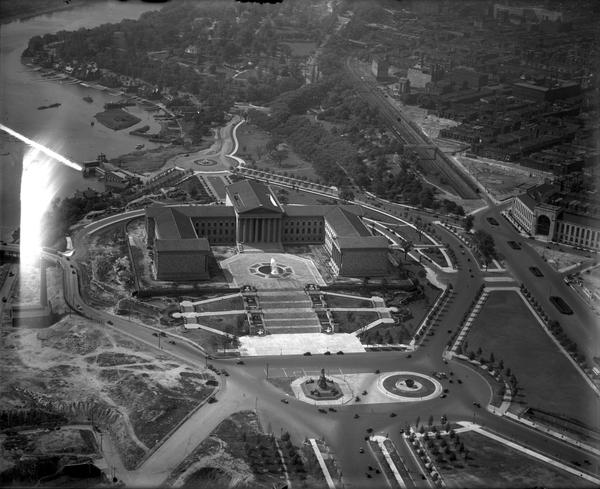 Aerial views showing the Philadelphia Museum of Art, built 1919-1928 after designs by Horace Trumbauer and the firm of Zantzinger,