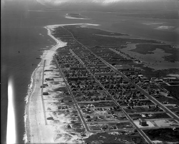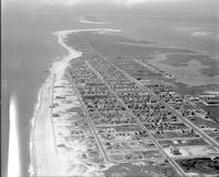 Aerial views of the seaside community of Beach Haven on Long Beach Island, New Jersey. Includes views of the city and coastline, the Atlantic Ocean and Little Egg Harbor. Boats are docked and sailing in the harbor. Harbor islands are also visible.
