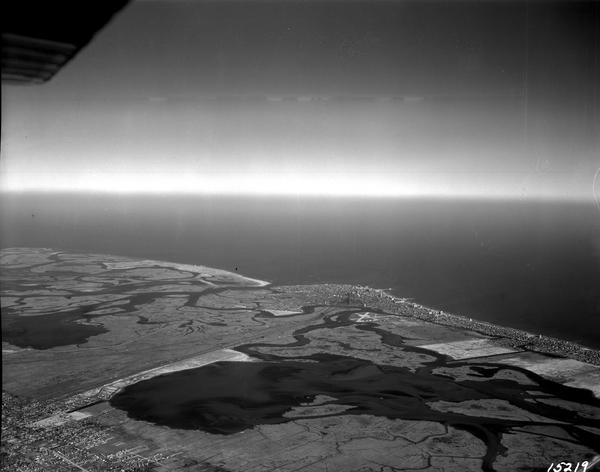 Aerial view of the New Jersey coastline taken from an extremely high altitude. The expanse of shoreline and adjacent inland areas can be seen roughly from Margate City to Brigantine. View is facing east towards Atlantic City from a vantage point in the vicinity of Northfield, New Jersey and is far enough west that Lakes Bay is visible in its entirety. Because of the high vantage point, many physical geographic features of the area can be seen but residential areas and other developments appear very small.