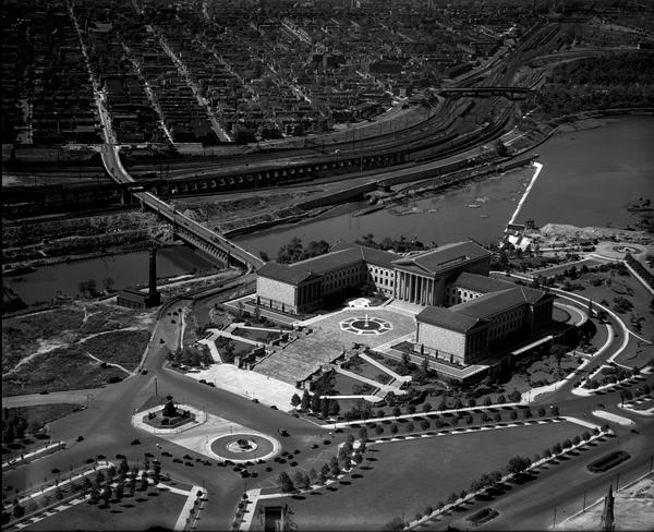 Aerial view showing the Philadelphia Museum of Art, built near the Schuylkill River 1919-1928 after designs by Horace Trumbauer and the firm of Zantzinger, Borie, and Medary. View includes part of West Philadelphia.