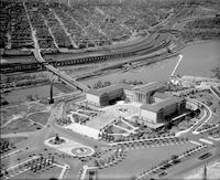 Aerial view showing the Philadelphia Museum of Art, built near the Schuylkill River 1919-1928 after designs by Horace Trumbauer and the firm of Zantzinger, Borie, and Medary. View includes part of West Philadelphia.