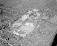 Aerial view of Girard College at Girard Avenue including Founder's Hall and the eastern and western outbuildings. The school buildings, designed by Philadelphia architect Thomas Ustick Walter in the Greek Revival style, were constructed 1833-1847. Girard College was established through a bequest from Stephen Girard, a Philadelphia financier and philanthropist, for the creation of a school for poor white male orphans. It opened in 1848. Row homes on the surrounding streets are visible.