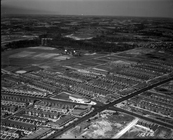 Aerial views of housing and real estate development located around the intersection of Cottman and Frankford Avenues in Philadelphia. View faces north from a vantage point just south of the intersection. Adjacent farmlands are visible.