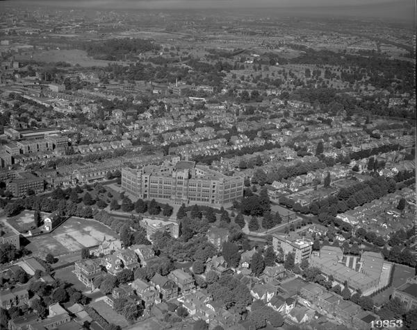Aerial view of Frankford High School, located at Oxford Ave. and Wakeling St. in the Frankford section of Philadelphia. Includes nearby row homes.