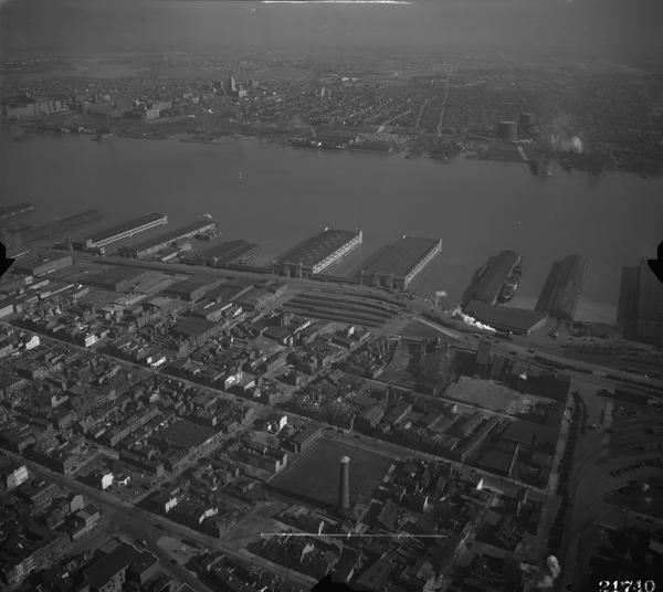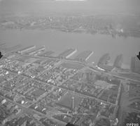 Aerial views of the piers along the Delaware River riverfront south of the Benjamin Franklin Bridge (formerly the Delaware River Bridge). Various types of boats are visible on the river, as are both the Camden, New Jersey and Philadelphia, Pennsylvania riverfronts. Views extend as far south as Oregon and Pattison Avenues.