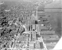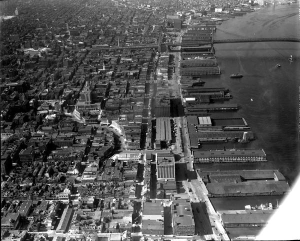 Front Streets. The Delaware River, Benjamin Franklin Bridge, piers and industrial buildings lining Front Street are visible