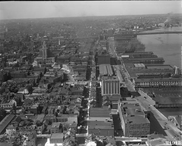 Front Streets. The Delaware River, Benjamin Franklin Bridge, piers and industrial buildings lining Front Street are visible