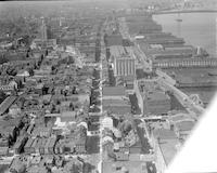 Front Streets. The Delaware River, Benjamin Franklin Bridge, piers and industrial buildings lining Front Street are visible
