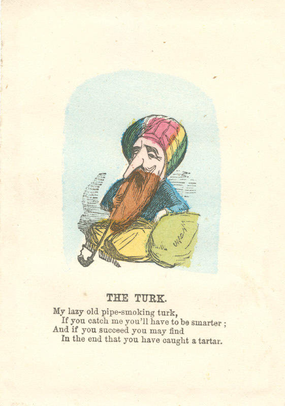 Text: My lazy old pipe-smoking turk, / If you catch me you'll have to be smarter; / And if you succeed you may find / In the end that you have caught a tartar.