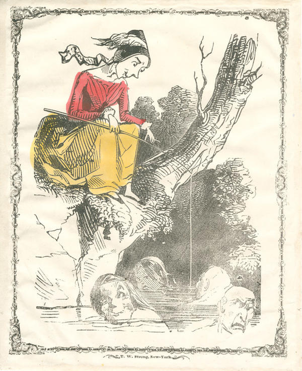 A woman sits in a tree holding a fishing pole. Men swim in the water in front of her.