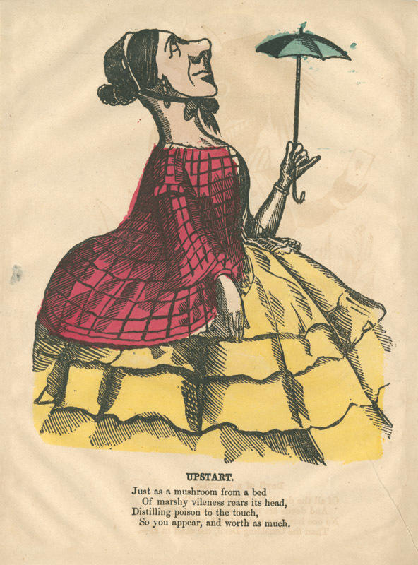 A woman points her nose up and holds a small parasol. The valentine mocks the recipient for being a social climber.