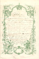 The handwritten note has a border with cherubs, grotesques, regal figures, and flowers.
