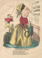 A woman reads a sign that says " INTELI- / GENCE/ OFFICE." She holds an umbrella and circle of rope. A young man thumbs his nose behind her. The phrase "not to know B from a bull's foot" means to be completely illiterate.