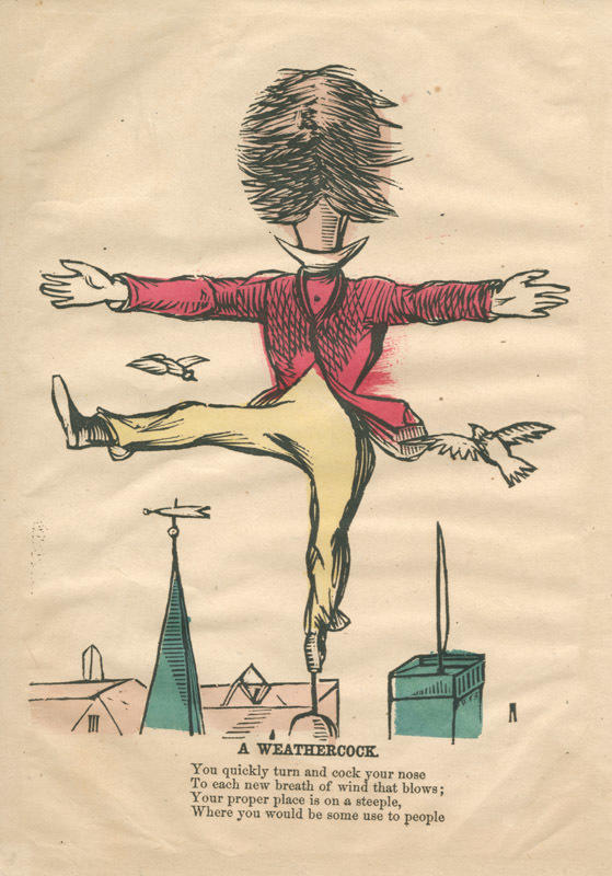 Text: You quickly turn and cock your nose / To each new breadth of wind that blows; / Your proper place is on a steeple, / Where you would be some use to people.