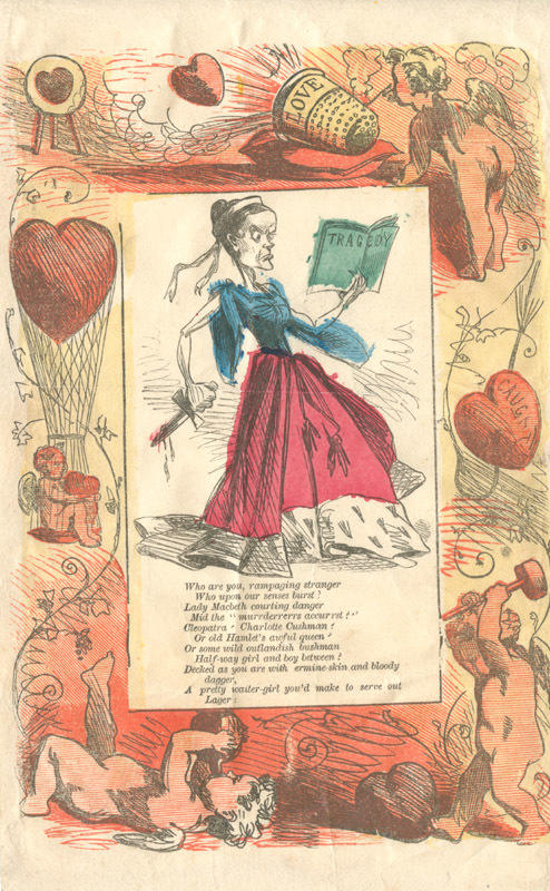 A woman holds a knife and a book marked "Tragedy." Her gown is trimmed with ermine and torn. The border shows cupids and hearts; one cupid shoots a heart out of a thimble cannon labeled "Love"; another cupid travels with a heart in a hot-air balloon; and another cupid hammers at a cracked heart below a heart on a fishhook labeled "Caught." Charlotte Cushman was a prominent actress in the nineteeth century.