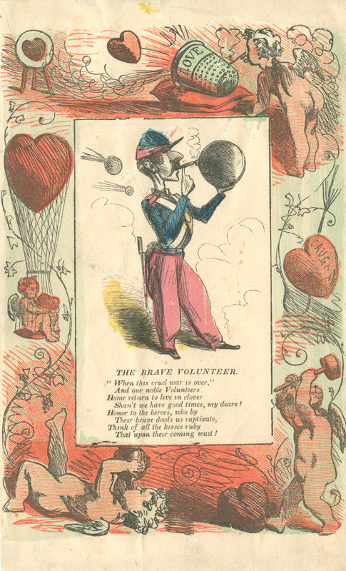 shows a Union soldier lighting his cigarette from a bomb as bombs fly in the background behind him. The border shows cupids