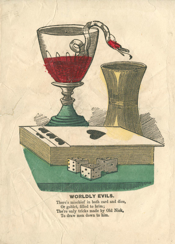 Text: There's mischief in both card and dice, / Or goblet, filled to brim; / The're [i.e. they're] only tricks made by Old