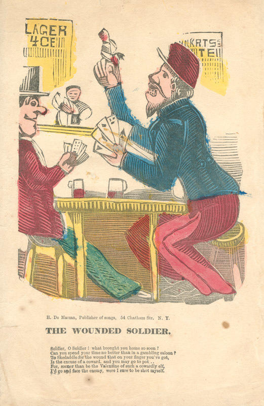 A Union soldier plays cards with another man. The soldier holds up a bandaged finger, and behind him is a bar with a sign