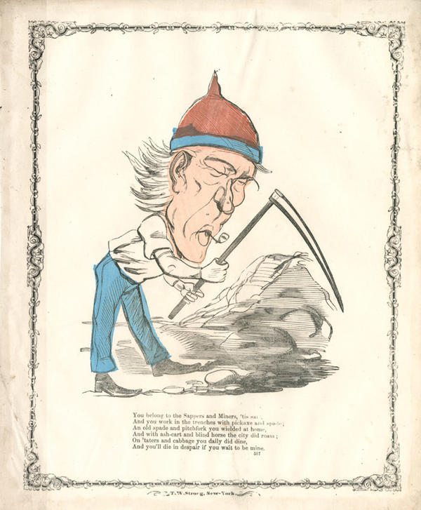 Text: You belong to the Sappers and Miners, 'tis said, / And you work in the trenches with pickaxe and spade; / An old spade and pitchfork you wielded at home, / And with ash-cart and blind horse the city did roam; / On 'taters and cabbage you daily did dine, / And you'll die in despair if you want to be mine.