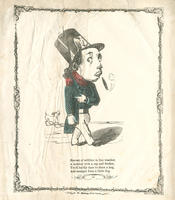 Text: Bravest of soldiers in fine weather, / A monkey with a cap and feather, / You'd hardly dare to shoot a hog, / And scamper from a little dog.