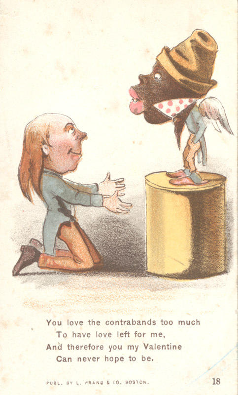 A white man kneels before a racistly depicted African- American man. The African-American man stands on a pedestal and has wings. "Contraband" here means "slave," and the sender rejects the recipient because of his sympathy for slaves. L. Prang & Co. first appeared in the Boston city directory in 1863.