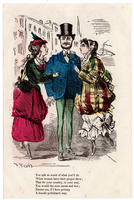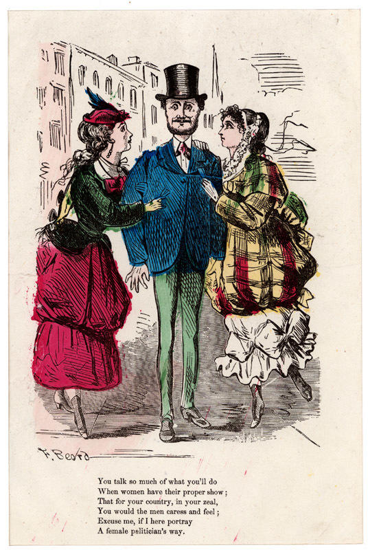A man stands between two women who wear restricted skirts that reveal their feet; they do not appear to be wearing bustles. He has a shocked expression as they both press leaflets to his chest. The valentine mocks women's involvement in politics and connects it with immodest and flirtatious behavior. Bustles were not in vogue between 1876 and 1883, as they were before and after those years.